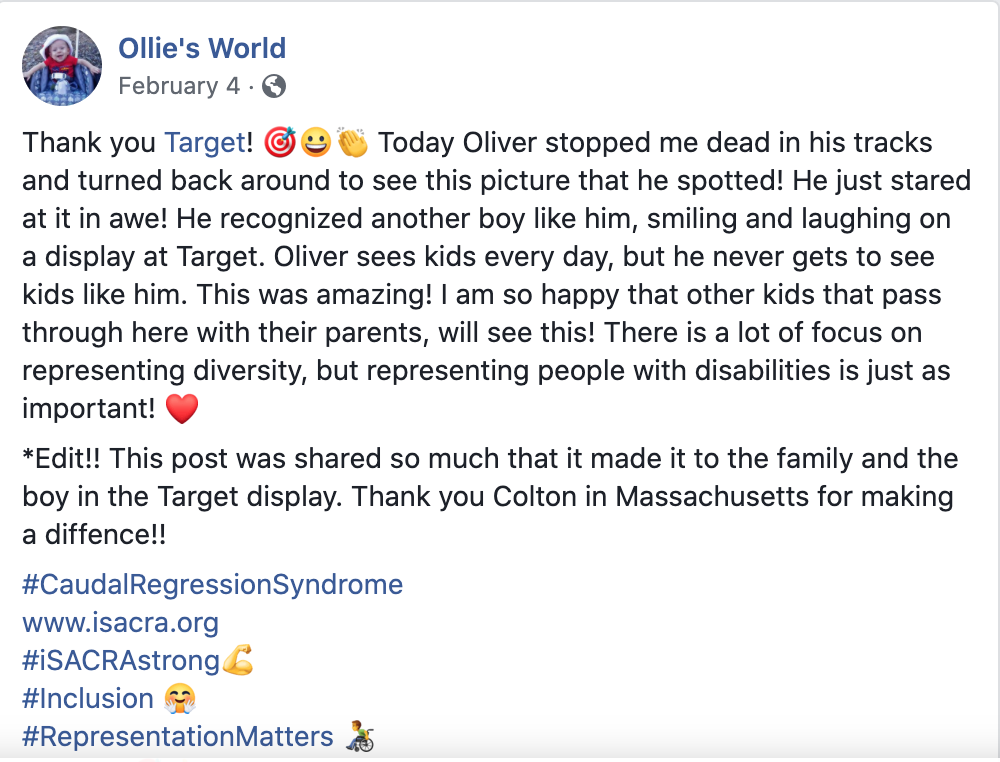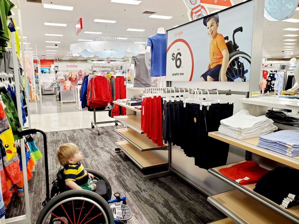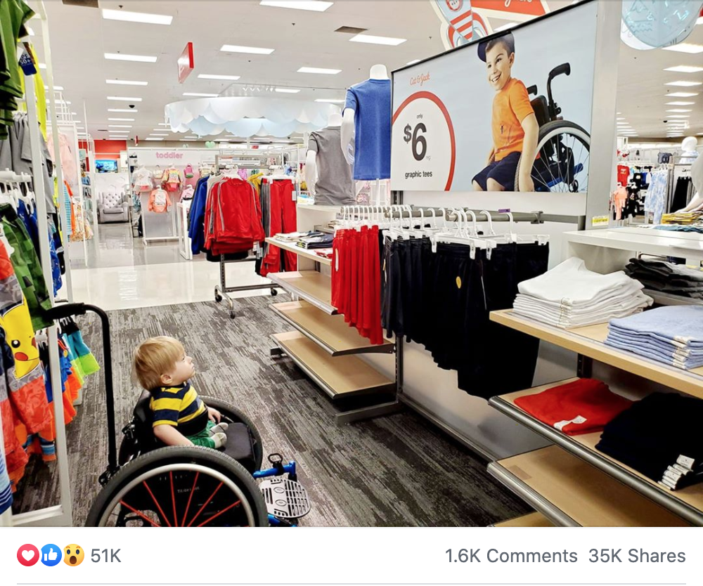 During a routine visit to their neighborhood Target store one day, Ollie was stopped dead in his tracks when he saw a huge advertisement on the wall starring a child that looks like he does. In the feature photo, you can see the moment after he spun his wheelchair around and stared in awe at the ad.